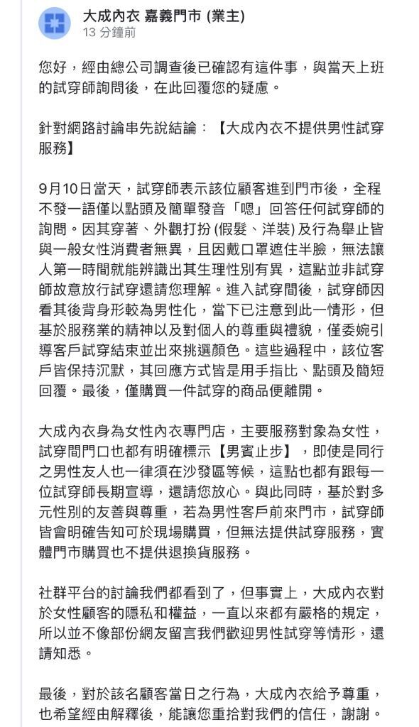 該位男跨女前去消費的店家是大成內衣的嘉義門市。在收到投訴後,店家回應說,他們身為女性內衣專門店,主要服務對象為女性,並沒有提供男性客戶試穿服務,試穿間也有明確標示「男賓止步」。然而當日該名男跨女戴假髮、穿洋裝,戴口罩遮住半臉,全程幾乎不發一語,讓人第一時間無法辨識生理性別,直到他進入試穿間後店員才發覺有異。