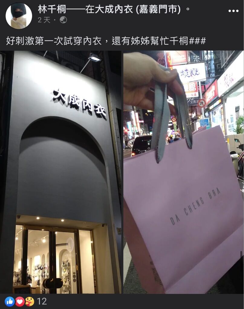 嘉義市一名無術男跨女林千桐在社群平台上分享自己第一次進女性內衣店試穿內衣,感想是很刺激,他更表示之後準備狩獵其他店家。而他的言論與過往事蹟在網路上掀起一陣討論,引發了許多女性網友們反感。
