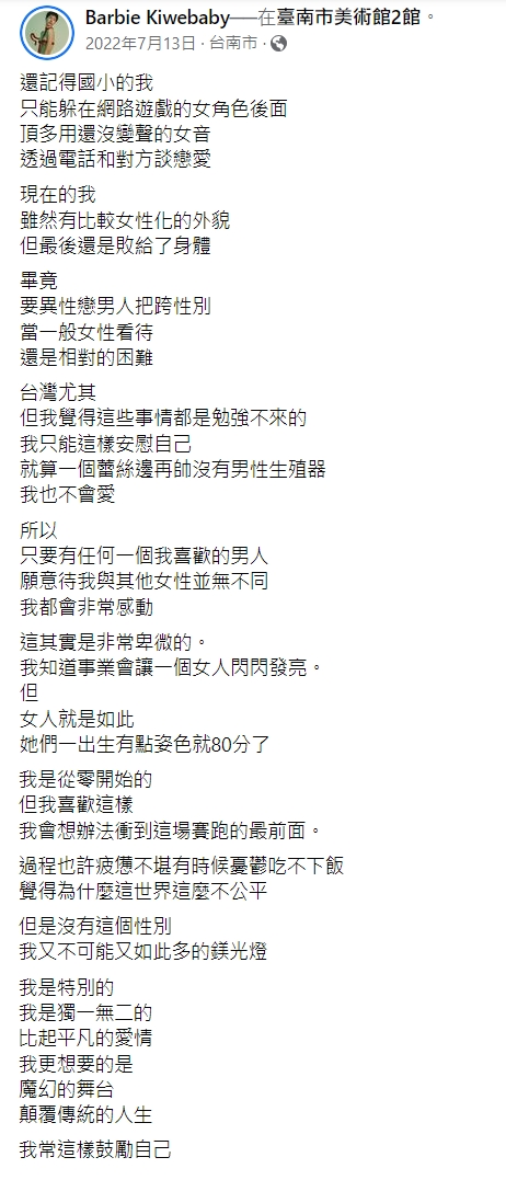 他表示,自己只要喜歡的男人願意把他當成女性對待就會很感動,這個願望多麼卑微,畢竟 女性從一出生有點姿色就已經達 80 分了,而自己是從 0 開始。最後鼓勵自己要更加努力。