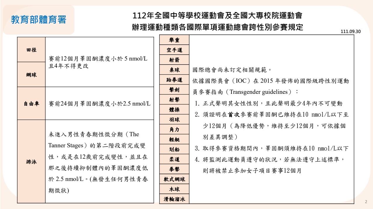 說明會活動資訊是在 7 月 6 日公布,並於 7 月 16 日下午截止,僅有不到 11 日可報名。根據體育署公布的文件,男性如果要跨到女子組參賽,申請辦法與去年相同,除了填寫指定的表格之外,申請者只需繳交一份性別不安診斷書,以及能佐證睪固酮濃度符合規定的資料。