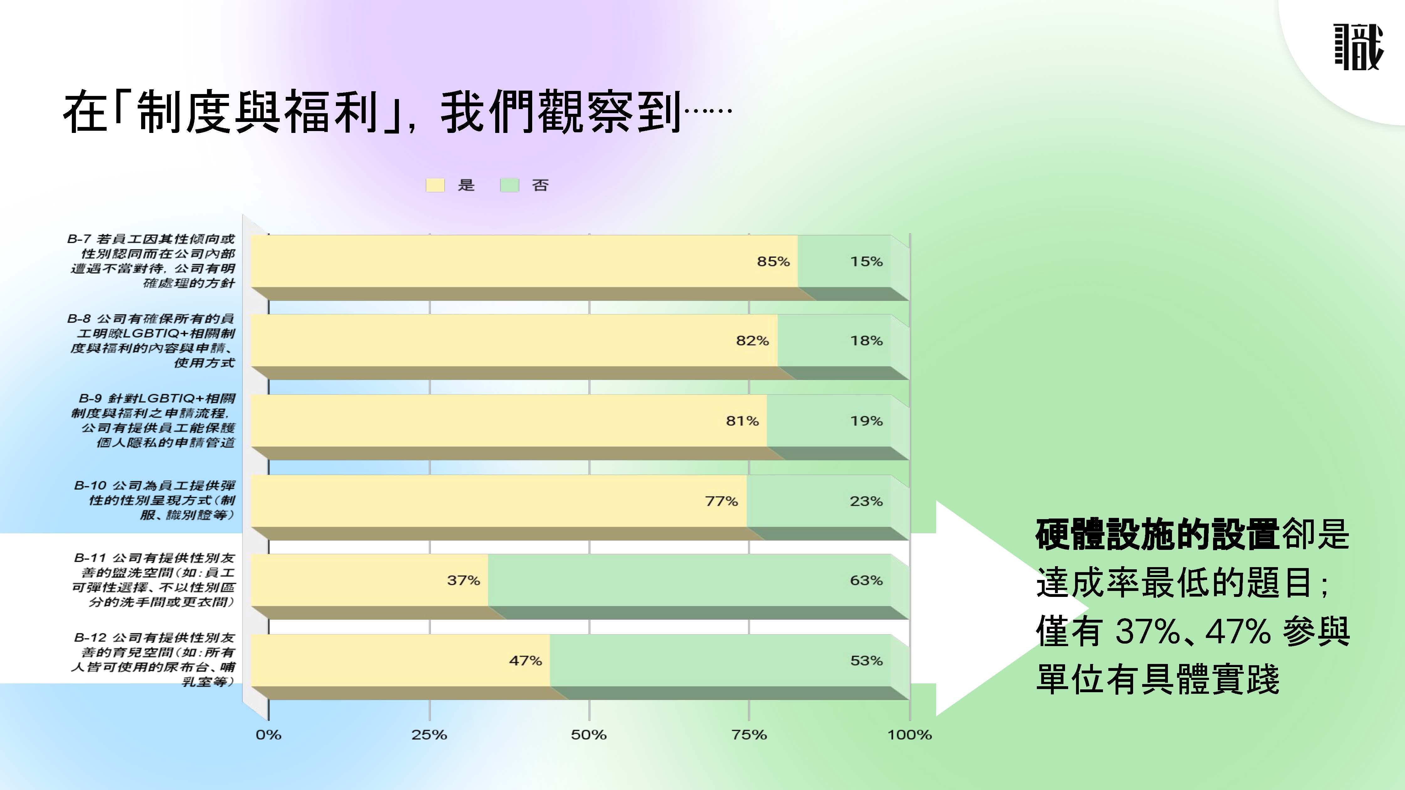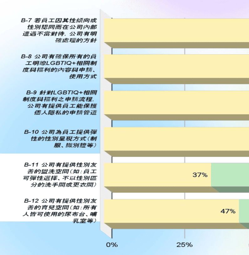 根據同志諮詢熱線和彩虹平權大平台公布的指標結果,多數參與評選的企業在承諾與態度有高達成率,然而兩團體認為,只有 47% 的企業提供所有性別都可使用的尿布台和哺乳室、37% 的企業提供不分性別的洗手間/更衣間 (或允許員工依性別認同選擇使用男女廁/更衣間),尚有進步空間。