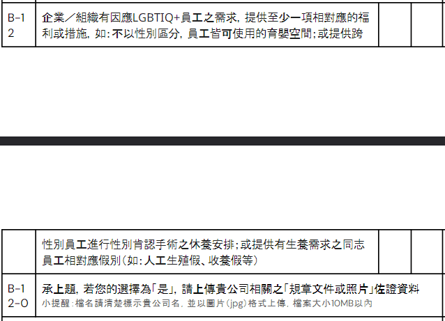 第二屆「同志職場友善指標認證」於 2025 年舉辦,此屆評比項目分為「大型及跨國組織」與「中小企業」兩種版本,針對大型及國際企業多評比兩項:1. 是否有至少一項福利或措施,比如提供不以性別區分、員工皆可使用的育嬰空間,或提供跨性別員工進行性別肯認手術的休養安排,或提供有生養需求的同志員工相對應假別 (如:人工生殖假、收養假等)。2. 是否內部宣導 DEI 概念時,如員工訓練、講座、多元共融週等,有講述 LGBTIQ+ 議題。評選結果將於 2025 年底出爐。