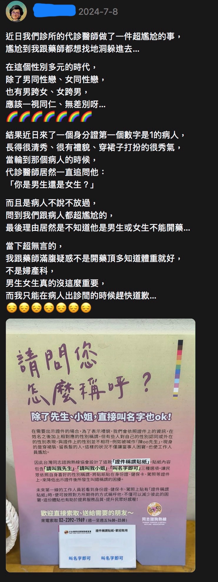 2024 年 7 月 8 日,一名於診所工作的王姓女護理師於社群平台 Threads 上發文,描述一位穿著裙子、打扮清秀,且身分證字號開頭為 1 的病患來看診時,代診醫師居然一直追問「你是男生還是女生?」,希望病患「親口回答」其性別,令她和藥師尷尬到想找地洞躲進去。